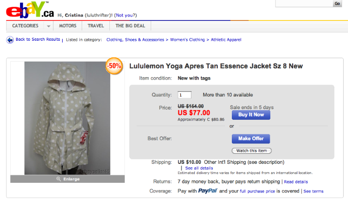 I’ve been very curious about the ebay seller “yogathrifter” who has a huge inventory of new with tag lululemon items that don’t at all look like knock-offs according to several purchasers. I’ve almost purchased an older Apres Yoga jacket from Yogathrifter but had second thoughts and felt guilty and unsure. I do like a good deal and I also really like finding older style lululemon prints that you can no longer find in stores but I don’t feel entirely comfortable purchasing from someone who is not a personal seller that just had buyers remorse or is closet cleaning. It really cheapens the product to have items like these sold online at a huge undercut and also it also diverts company profits that would otherwise be going to the design team, seamstresses, and factory workers. I’m not sure what this sellers (or other sellers) sources are, perhaps the factory that produces the garments for Lululemon also produces extras on the side that they can later sell, maybe they are failed quality check items, maybe it’s inventory shrinkage. Who knows, maybe they are completely legitimate items purchased in “we made too much” or the Factory Outlet. It is a little suspect though that this seller has an alleged warehouse that several people have visited for shopping. When I first almost purchased the jacket I was told I could come check out the other sizes to see which fit best. I wish I would have gone because when I later made a request to go for a visit and see what was in stock for a cash purchase my request was ignored.