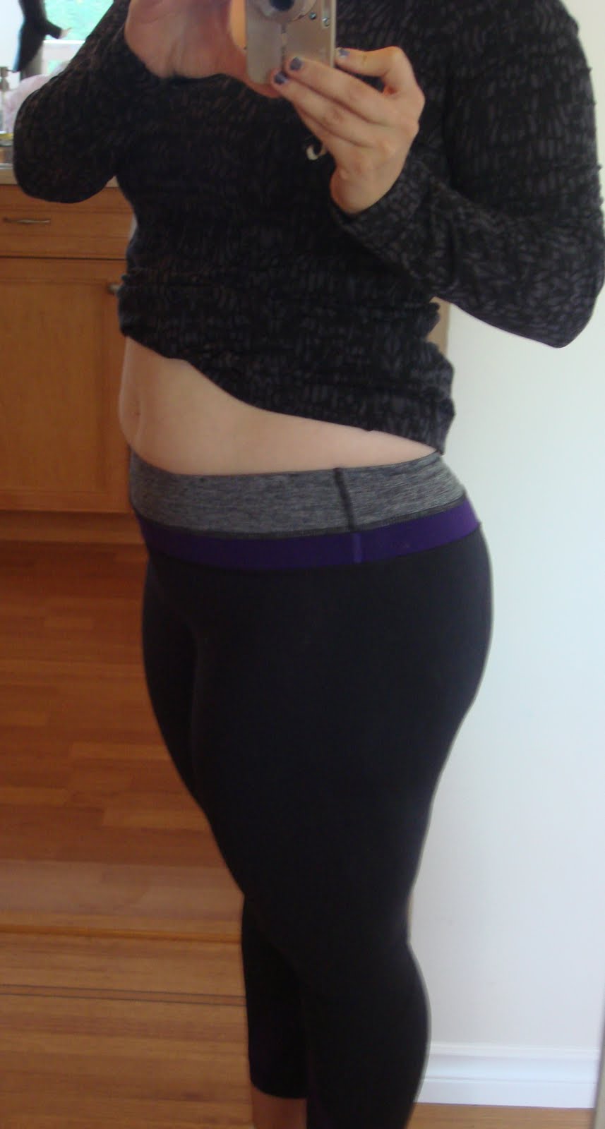 This picture shows the rise on the Inspire Crops which are higher rise than my Run: With It Crops. As you can see here it creates a bit of muffin top but not enough to bother me. I prefer a slightly higher rise so that I don’t show plumbers but when I run and so that I feel more tucked in. I got this in a size 8 and I’m glad now that I’ve been wearing these all morning that I didn’t go with a size 6. I’ll be running in them this afternoon so i’ll update on this post how they’ve held up.