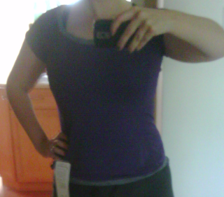 As requested, a picture of my personal best SS. Sorry, my camera has a dead battery and had to use my crappy cell phone camera. I would judge this top based on the picture above. The top is a size 8 and it’s looser around the middle than my picture bellow indicates. Lifting my arms stretched it out a bit. With my arms down at my side it pools a little bit (not as much as above) which I really like. This top I think would look great with jeans as well as for running. I love how the staps on on my Free2be bra show for casual wear, and my flow y straps looks cute too, but if your using something like the Ta Ta Tamer it may not look so cute. Something to keep in mind.