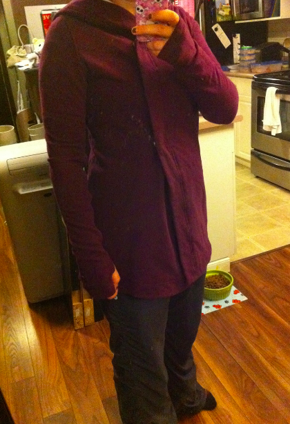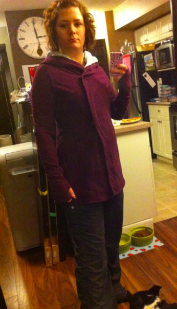 I normally take an 8, with exception to the strides and remixes, which I size down to a 6 for the tighter feel so I grabbed both a 6 and an 8 to take to the change room. The 8 was definitely too big, it made me look huge! It had a very “sack of potatoes” look to it. I tried both colors on in the 6 and the plum definitely looked better, which I think is due to the fact that plum looks dressier than the light grey does. Unfortunately I was wearing lined DSP’s, which I bought in a size bigger to be looser so I had quite the hobo chic look going on. It was very comfy, the sleeves were very fitted and cute and I can see myself taking fall strolls, arm in arm with my hubby, through town, crunching the leaves, and window shopping. Yeah, thats right, this wrap will change my life! Haha, suuuure! It is very cute though!