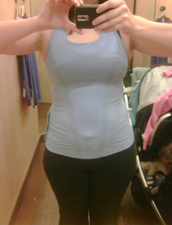 The Candlelight Tank (size 8). I liked it because it was super soft. Much softer then the Organic Cotton of the Gathered Racerbacks or any other Organic Cotton Lycra blend I’ve felt from Lulu. Very, very soft tank is what I’m saying. I’m undecided if I like this tank enough to buy though. The Ombre stripe on the side of the light grey one (dark grey one is all solid) was interesting but maybe not so flattering. The straps in the back were pretty and very similar to the Free to be Bra. Slightly complicated getting this on, but then again I was getting flustered by a loose toddler opening dressing room doors. Mesh bra – I like just wearing my own bra so this was a slight turn off. that being said, with the pretty back detailing you need the built in bra. The fit was a lot like the Power Y but slightly more forgiving around the torso.