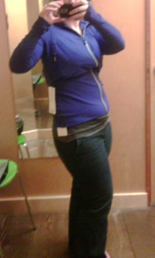 I went to Metrotown today in hopes of seeing the new SE Sparkle Scuba Hoodies, Cuddle Ups and Sailor Stripe Stride, Relaxed Fit Pants and Power Y but alas it was not meant to be. Instead I tried on the Lift Your Spirits Jacket in size 8 Wish Blue just for kicks. I really, really loved Brushed Power Luxtreme and hope they make a Stride in this material and running crops. It wasn’t as warm as brushed luon or as soft but it felt velvety, thin on the inside which I really liked and stretchy. Sadly the design of this jacket, although slimming just wasn’t cutting it for me. I just couldn’t get over the weird poof on the upper back. In the poof, there are also small pleats in the back that are designed to keep the poof constantly puffed out. As My Superficial Endeavors stated yesterday, the profile of this jacket is very slimming because of the chevron strips and the narrow waist.