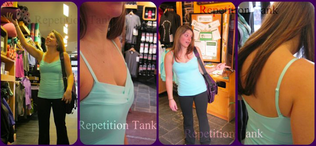 The Repetition Tank has the same mesh waffle detailing at the neck that the matching Repetition Crops has on the calves and thin adjustable straps. I wouldn’t be surprised if this also came in Concord Grape to match the Concord Grape Repetition Crops.