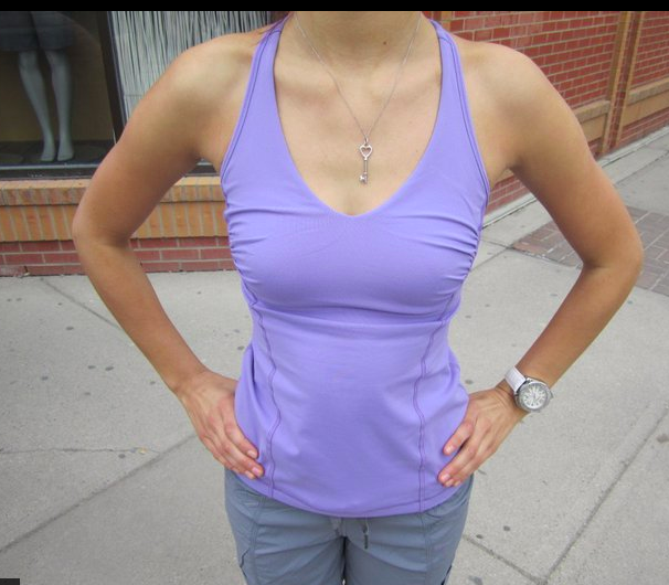 Early reports of the Circuit Tank are that this is a great little tank with moderate support – Good for pilates, Yoga, elliptical trainer and spinning but probably not for high impact activities such as running without another bra worn underneath. One knock against it is that it’s tricky taking it off with the way the back is designed so if you hate fussing with removing tanks or bras after a sweaty workout, keep that in mind. Although it has removable bra straps so it’s easier when you unhook them and then take the tank off. I really love the design of the side boob ruching and if you have a larger bust it will really look great with that detail. I think the ruching is a bit lost on smaller bust sizes. I’m most drawn to this tank in Tango Red with Grapeseed as my second choice but not sure I need it. This top picture though makes me want to try it out since it looks so fantastic on her.
