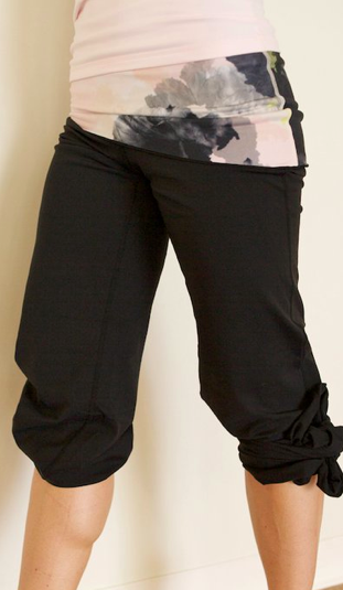 I tried on the Waltz Pants (retail for $98) today fully expecting not to like them. I saw them in store yesterday and there were things that sort of turned me off of them and so I poo-pooed them and didn’t give them a fair chance. The things that turned me off at first were the unfineshed edges on the bottom hem and at the bottom edge of the waist fabric. It’s basically a raw edge with a surge seam over it which makes it look really casual, especially since these are luon light and not the regular weight luon used in Still Pants or Relaxed Fit Pants. I was worried that the waist would be really lose fitting, sag down or just not feel supportive enough around my waist so that it would stay put. The pants are reversible so the waist panel fabric is not stitched down so you are able to flip it around the other way and adjust how it sits on you. I also didn’t care for the Canvas Print on these ones that I tried on but I wanted to see what the waist fabric looked like in stark contrast against the black pants so thats why I chose those to try on. Also, I thought these pants had the hidden cinch cord at the bottom that lets you adjust the length into crops or to save you from getting them hemmed but they actually do not.