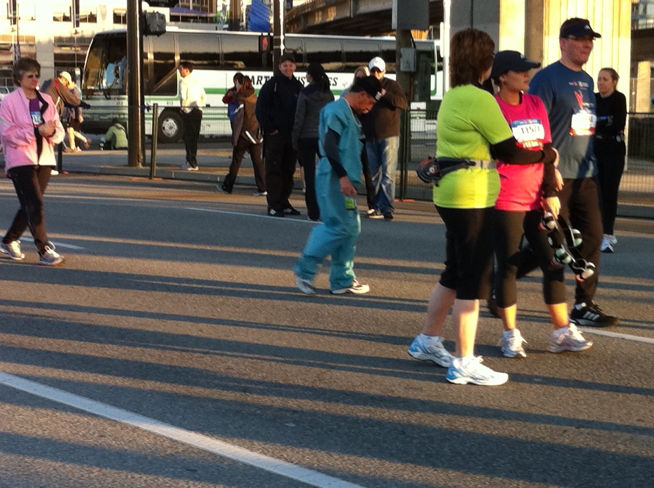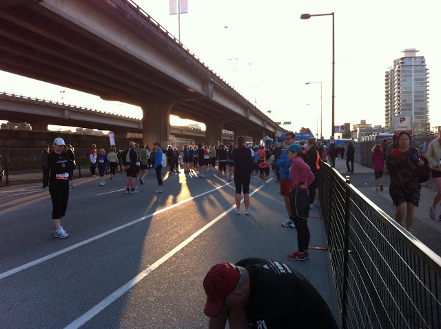 Lined up at the Corral at 6:30am counting all the lulu in the crowd and freezing my hands and ass off. I wore a cheap and pilly cotton long sleeve from the gap and threw it off and into a garbage bin after the first mile.