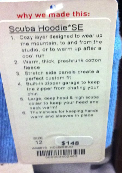 One reader has asked her store about the price increase and was told that the Micro Stripe Scuba’s (previously released in December/January at $98) are now priced higher then the solids because of a more ‘expensive process’ to create the pattern and that the rising cost of cotton is behind the $30 increase. Solid Scuba’s are now priced at $108. I wonder what true ‘Special Edition’ scuba’s will be marked up to when something as basic as a micro stripe pattern gets a $30 increase. I find it totally outrageous that previously produced hoodies are getting re stickered at the higher prices. What would something like the Pillow Scuba or the Vest Scuba be priced at with all of the extra seam detailing on it?