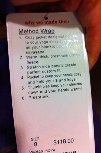 Umm I love the Method wrap!!! I missed our on the Savasana as I was a complete newbie and knew nothing of Lulu supply and demand…. I wish it had the print inside but the snaps and zipper were a wonderful addition! I love snaps! I tried on the black in a 10 and it looked big on me! Go figure? Maybe the black us different? Picked up the Universal wrap instead (ZOMG) and am obsessed with it. Thanks for all the great posts!!!! LOVE your blog!