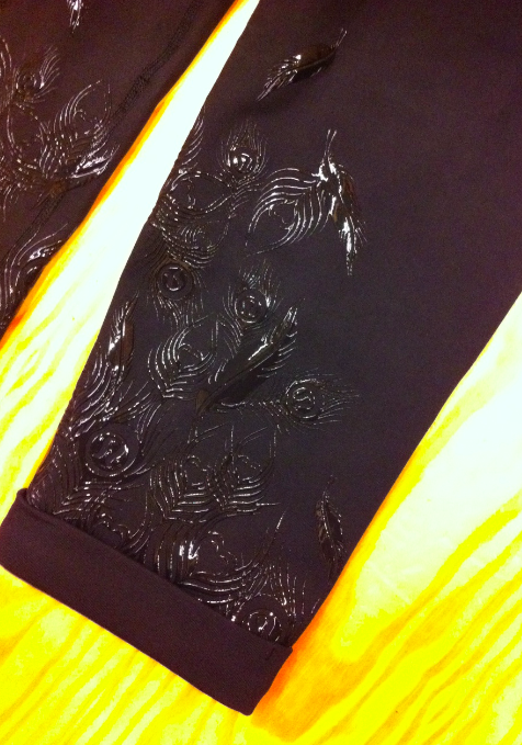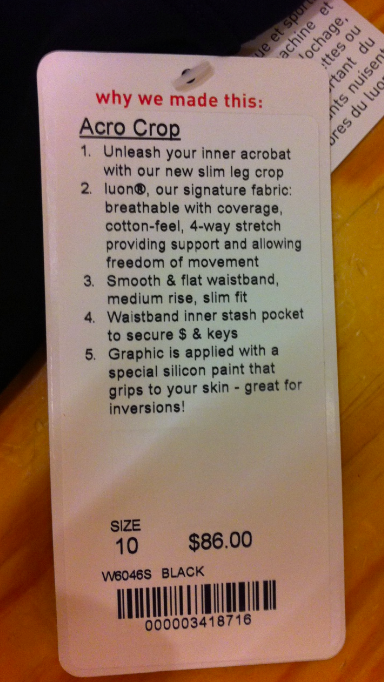 The Acro Crops were really cool. Sorry, no pictures since I grabbed the wrong size and then was too exhausted after policing the dueling children to go out and get another size. They have the rolled cuff just like the Cali Roll Crops from last year at the lab and it has a really, really pretty silicone feather print on the lower calf. I’m really sad that the feather print CRB tank isn’t like this, embossed silicone overlayed over a non poly tank. I’d pay a few dollars more for that one.