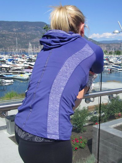 Sadly, it looks like this Vinyasa scarf is the same size as the initial run which was priced at $32. It’s not finished with grossgrain ribbon like the original was either. That being said, I’d have to say this is my favourite one I’ve seen (heathered dewberry running luon) but so not worth the price. I’m quite outraged that an item as simple as this one has seen 3 price increases in one year while the detail to construction has decreased.