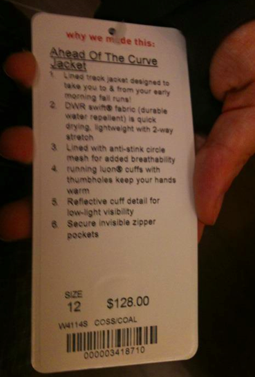 Dear Lulu, why did you have to go and ruin something with such potential. Twice now. I loved Coal Shale Stripe and ended up returning the Speed Skirt in Coal Shale Stripe because it was stupidly made with 2 way (actually, it’s no way) Stretch instead of 4 way. And now a new running jacket in Coal Shale Stripe which looks lovely and reasonable in the front. And the back…is just redonkulous. Bahumbug!! Maybe I need to just try this on and see, perhaps it needs to be a bit more fitted in order to loose the volume in the back.