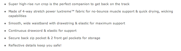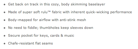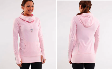 Big thank you to Lise for sharing her stores product alert email (Montreal). I’m in LOVE with the Run: Stay On Course Pullover which is identical to last years Run: Ambition Pullover. I’m not sure why they renamed this pullover but it’s pretty much identical. Both are made of brushed Luxtreme, have the same cuffed hem with wider band in the back, back pocket and kangaroo pocket and the same cinch cords at the neck line. Ah well, whatever it’s called I love it. Brushed Luxtreme is really nice for a pullover because the inside feels really soft like brushed luon and the outside is more durable than luon and crisp looking. I also found it less permeable to cold wind than luon pullovers are. This better hold off on getting widely released until after Christmas. I believe I got my Ambition Pullover on Boxing Day last year.