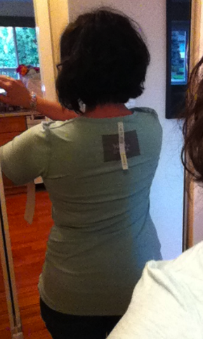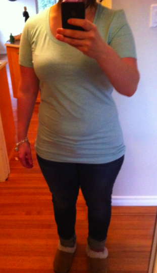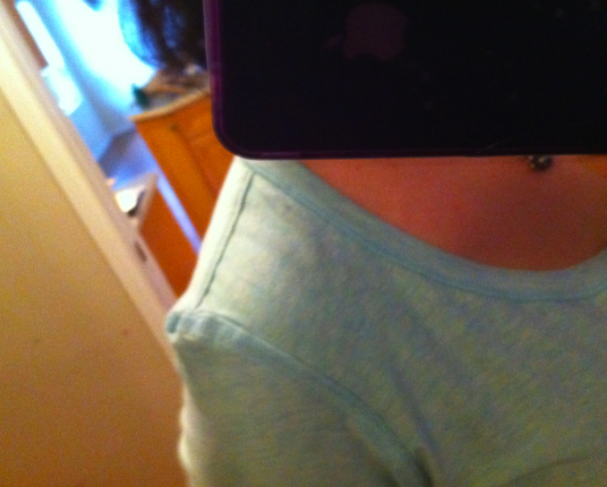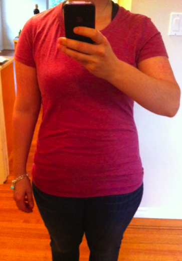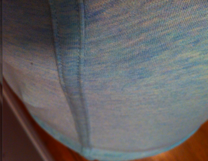 I decided to use one of my little gift cards today with a wee balance on the Every Yoga Tee and I am really glad I did, I like it a lot. I went with the size 10 which is my TTS but the size 8 which I sometimes size down to fit very well also with good length and roomieness. I honestly would have been comfortable in either but ultimately I liked the extra length of the 10 which I could scrunch up more around my muffin top or wear over my butt with leggings, but it took me a good long time to decide between the two. The Vitasea material is silky, silky soft and it can be worn inside out as well if you don’t mind seeing the stitching at the shoulders which I’ve posted a picture of. One really nice detail about this shirt is that the inside seam on the sides is actually piped (a folded over hem, I think thats called piping). It’s not technically designed to be worn inside out but I love that little love note detail at the upper back so I will wear it both ways. My favorite things though are the slightly scooped neck and the longer sleeve length which is really flattering if you don’t have buff arms (although with crossfit I’m seeing some great arm and shoulder definition which I never thought I’d see). For comparison, I have the Lively Tee in Raspberry and I really don’t love the fit of that one on me as much. I think the Lively Tee is roomier in the middle and less clingy and also shorter in length so it’s a tad boxier, also the sleeves are shorter and the neckline is more of a crew neck. Picture below for comparison.