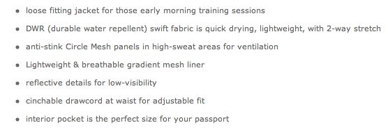 I tried on the Run: Travel To Track Jacket earlier today in my TTS 10 and although I love the material and print, the fit was totally off for me and my proportions especially with the peplum waist. The fit was boxy and quite loose in the torso and in the arms (which is nice for a change), but the length was way, way too short for me. The jacket felt too loose and boxy on me and if I raised my arms slightly my stomach was exposed. Sizing down would have been possible if there was more length on this jacket. I did love the little iphone pocket on the inside though. I hope all future jackets have that feature included.