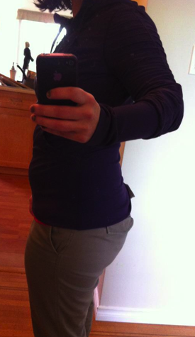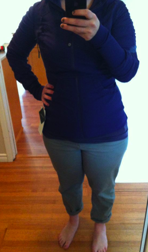 I managed to find a Dance Studio Jacket in my size yesterday, size 10, and I decided to bring it home and think about it as a birthday present option. My husband never usually gets me lululemon for my birthday but he agreed to this year probably because I wasn’t giving him any other good ideas. Anyways, I’ve been eying the Dance Studio Jacket in all the pictures I’ve seen so far and really loving it on others (particularly in this color) but I just couldn’t decide if it was a style of jacket that would fit into my daily wardrobe. I tend to wear either knit wraps and cardigans for a bit of a more stylish look or my Sing Floss Travel Jacket or Gratitude Wrap for more casual days. My Stride jackets have always gone unworn since they don’t fit the cozy factor that I need when I dress casually. I decided that I could take more of a risk with a birthday present than something I’d get myself. This jacket is surprisingly cozy thanks to the sheer luon jersey on the inside but it’s more structured and sliming than a hoodie. My husband really liked it on me when I tried it on so I definitely think it’s a keeper. He’s a hard critic of lululemon clothes afterall. The sizing is comfortable in TTS and the arms and chest are roomy enough. The bottom portion is fitted and can show muffin top but not enough to make me not want to wear it. I think since it’s so fitted it’ll look fine if I lost weight where as a 12 would look perfect now and then be too big. I can wear this over top of a cabin ls comfortably but the arms lose it’s looseness. Most people are sizing up in this jacket one or two sizes and I can definitely see that if you have a large bust, muscular arms or broader shoulders but I don’t tend to feel restricted in the arms with lulu clothes generally so I’m fine sticking with this size I think. I maybe wish there was a touch more length to this though and maybe slightly more a-line at the hem.