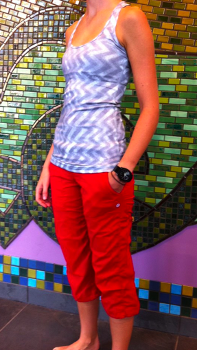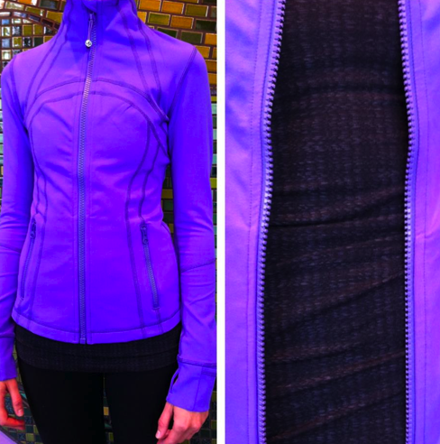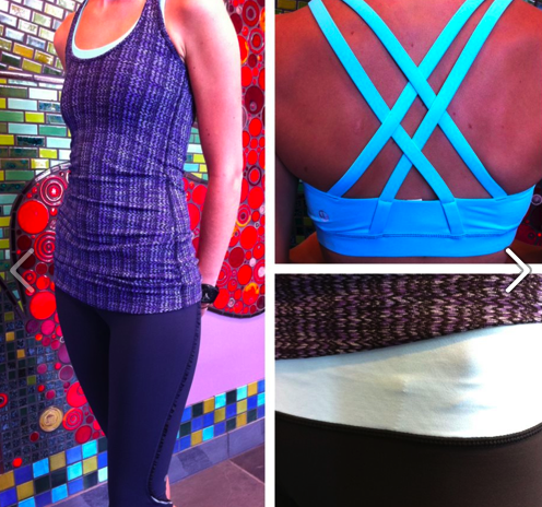 I stopped in at my store today to have a look at the new items and there was not a ton in. I did see the new Every Yogi LS’s in and there was one that was Heathered Angel Blue that looked super similar to the Cabin LS (version 1) in Heathered Haze from 2010. The Deep Indigo Striped Every Yogi reversed to Heathered Deep Indigo (just like the Vitasea Daily Tank) and the Solid Currant reversed to Heathered Ghost. I also had a look at the new Ziggy Striped Xlong Cool Racerbacks and I’m almost positive I’ll be returning it. It’s pretty enough and soft on the inside but it’s also quite thick and feels like it will be very warm to work out in. I also think the material since it’s a looser knit will be prone to snags. Too bad because it has a slight Missoni vibe to it, but the pattern is quite busy for me. The other zig zag CRB ‘Blazer Fossil’ in regular length (pictured below) is a high polyester version. No new Define Jackets which was too bad because I really wanted to try on the Power Purple Define I ordered last night. Since I’ll be returning the CRB, if the quality is good on the jacket I’ll likely keep it. I also wanted to have a look at the Deja Vu Scarves and in particular the color ‘Deepest Cranberry’ but none were in. What else….Oh right, no new Currant Dance Studio Pants/Crops, no Power Purple Swiftly’s (seen on the Australian/New Zealand Website). No Currant or Caspian Vitasea Daily Tanks but I did see the gorgeous Angel Blue Energy Bra which was tempting but it wasn’t stocked in my size yet so I didn’t have to use willpower today.
