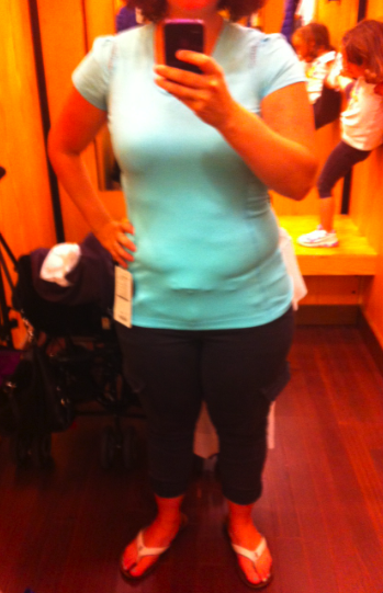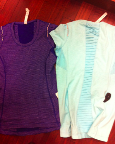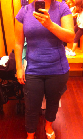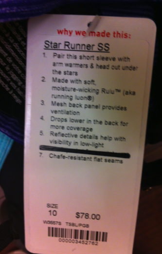 I really liked these RULU ‘Star Runner SS‘ tops but I’m wearing them here with my most muffin top inducing pants so I need to try them on again with other pants. They are shorter than last years Full Tilt SS which is a shame because I really liked the added length of those. These ones are shorter and also are priced higher at $78. I think they are too warm for me to wear to crossfit and I probably wouldn’t wear them casually due to the reflectivity and the mesh ruffle detailing on the back so I had to pass.