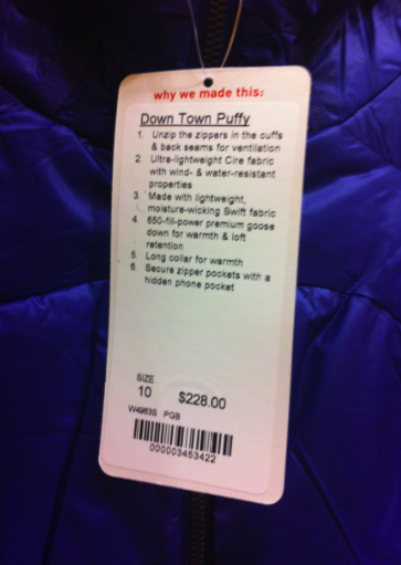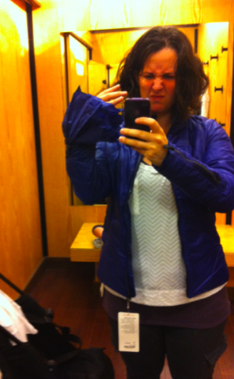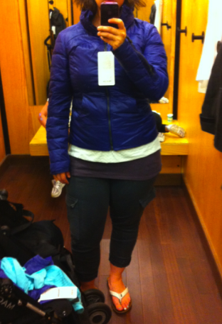 A few new items in store today. I tried on the Down Town Puff in size 10 and it was quite nice. I really liked the fit and the fact that it didn’t look huge or overwhelm me. I could layer a cabin LS, swiftly or a thin knit sweater under my TTS but not anything really thick. My big disappointment with it besides the price ($228!!!!!) was the zipper at the cuff. If you unzip it you get ruffles upon ruffles of magician handerkchief spilling out and when you zip them back in they don’t lay as flat as they did before you unzipped it. I really don’t get the point of that feature. Inside the jacket at the upper back there is also a big zippered pocket. I’m not sure why anyone would ever use a pocket in that spot that you can’t access while the jacket is on and if you place anything in it it would look odd and also not allow you to sit back. Overall, I did really like this jacket and how it looked on, but judging by the fact that the Coco Softshell is now marked down from $228 to $99 today, after just being out two weeks….I think lulu is teaching us we can now wait some of these highly priced items out for markdown.
