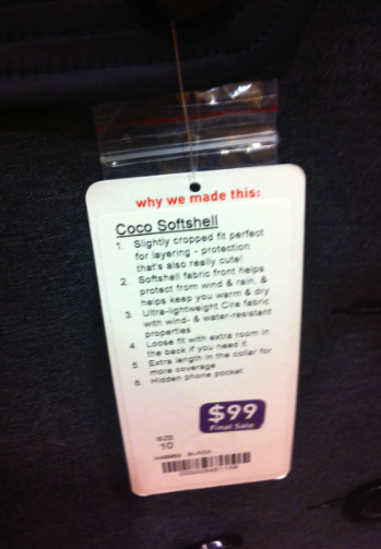 All colors of the Coco Softshell were on sale today at $99. I was tempted and almost got one but I tried it on again and my husband is right. The shoulders really are unflattering on me and create a triangle shape thanks to my pear shape.