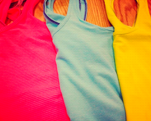 I managed to drag my sorry butt to the store today despite a horrible summer cold but I really needed the Heathered Angel Blue CRB. Uploads and product drops have been so funny lately that you never know if something will be just in stores for a few weeks or just online (Angel Blue Energy Bra, Power Purple CRB). The Angel Blue CRB is gorgeous and just like the Heathered Power Purple and Heathered Deep Coal CRB’s with the same fabric composition of 47% polyester (97% Poly are the icky printed ones, no polyester at all are the solid CRB’s like Pop Orange and Pow Pink) super soft, thin and silky. I’m not sure but I think the Angel Blue CRB fits slightly smaller then my Power Purple. I’ll need to try it on again later today when I’m feeling less like poop and let you know for sure. It’s definitely not enough to size up but it does feel ever so slightly more fitted – I did find my power purple and coal ones stretch out a bit though so thats probably why. Split Pea was pretty as well and really soft and the Light Flare Stripes was pretty but neither of those two are really my colors. I wish I’d gotten the Heathered Tree Frog CRB when it was out last year, I really liked that one but ended up passing. I think Heathered Tree Frog is slightly greener and more interesting then Split Pea which is a bit more chartreuse.