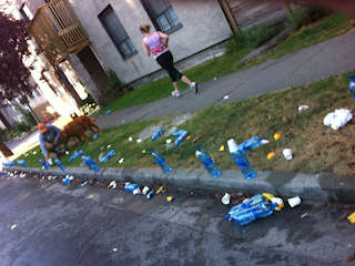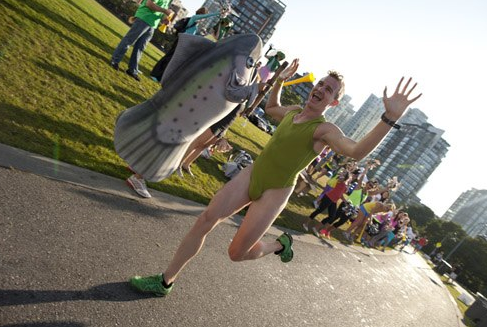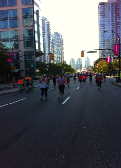 I ended up running this race a lot slower then I did my BMO half but I really expected that and was just wanting to make it across ‘around 3 hours’ and just have fun. I ended up not training very much for this one and pretty much stopped running in June so the result was a very painful last 4 miles. At 8 miles of this race I was ahead of the game and had I been able to keep up that pace I would have bettered my BMO time. Unfortunately my lack of training coupled with wearing minimal shoes with no cushioning meant my feet were in a lot of pain at that point and I could not run for more then a few minute spurts. I basically walked from mile 8 to mile 11 where I met up with Lululemon Addict (we had started the race together and then separated) and she was feeling so good and was so focused that she pushed me along those last few miles and cracked the whip on me a few times. once close to the finish line the lovely eductators were madly clanging the cow bells for me (so much appreciated) and cheering me on across the finish line and that really helped me to power thru the pain. I also really liked that fruits were offered at each of the stations (BMO didn’t do that) because I felt the orange slices did more for me then my gels did. After the race I took one look at where I had to go for the catered breakfast and my feet just refused to walk over. I’m glad I didn’t attempt it because as it turns out breakfast was finished at that point so it would have been a waisted painful walk over. I really wasn’t actually hungry for food anyways, I desperately wanted a sugary iced Starbucks drink so I took about 40 minutes to hobble the 600 meters to the nearest starbucks, stopping and resting my feet and collapsing in a heap every 2 feet. I was sure at that point that there would be no way I’d be able to make it back downtown for the concert in three hours but when I got home (had an an hour and a half to rest) I soaked myself in an epsom salt bath (painfully discovering that I had a chafing situation and two severely damaged toe nails) and downed some advil, ate a yogurt and then decided I really didn’t want to miss the concert so I put on my cushy Native Flip Flops and drove back.