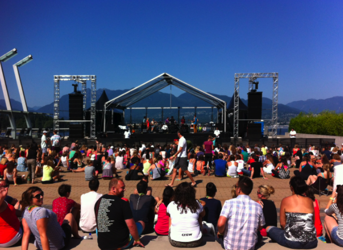 The concert was so amazing. It was so hot out and the venue (Jack Pool Plaza where our olympic torch is) was absolutely beautiful. The stage was made so that you could see the view of Vancouver as the backdrop and as the band Fun played you could see the cruise ships slowly drifting past while huge dragonflies buzzed around above us.  I don’t know how lululemon managed to have Vancouver so ‘on’ just like all of the entertainers where but Vancouver showed it’s very best this weekend and played along with lovely wether and nicely timed cruise ships and float planes.
