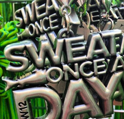 The medal is removable and can be used as a key chain or zipper pull on a bag, the ribbon is shoes laces with the SeaWheeze colors and SeaWheeze written on it.