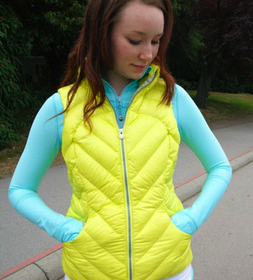 Love these pictures of the Heathered Angel Blue Define Jacket paired with Split Pea Down Town Vest. I tried on the vest today and found it TTS and flattering on for a vest (usually they don’t flatter me), although to wear it over something thick like a scuba I would have sized up one. The TTS was perfect for over my Define Jacket though and probably a thin hoodie like the Carry and Go. As flattering as this vest fits though, it’s got no hood, no zippered pockets and it’s not reversible so I just can’t get down with paying $10 more (and more than that for earlier models like the Peace of Mind Vest) for fewer features. It feels less stuffed than my Peace Of Mind Vest with a lower profile. They didn’t have the Pigment Blue in but the Split Pea was surprisingly nice in person and seeing it on I’d probably opt for that one or Neutral Blush for a neutral.