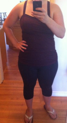 I’ve been wanting the Run: Catch Me Tank in several colorways already and ended up returning the Power Purple version for one reason or another and by the time I decided I needed the Angel Blue Tonka Stripe one it was sold out online and at both nearby stores. Yesterday I received Bordeaux Drama from my Monday night order and I fell in love with the color in luxtreme instantly, especially sine the bust has subtle Tonka Stripes. Sadly, I was having a bloaty day though and was wearing jeans when I tried it on so my initial gut reaction was ‘on no! this must go back! I’ll never wear this’. That irked me because I love the look of it and love luxtreme Bordeaux Drama. Anyways, today right before Crossfit I decided to try in on with my Ebb and Flow Crops and I decided I loved it again (with non muffin top inducing pants) so I took the tags off and wore it to Crossfit. I also adjusted the bust band and the straps so it’s much looser and now I don’t have my bra fat spilling out of the back. With the straps looser the support is lesser but it’s pretty much on par with the Power Y, perhaps a bit better. I’m not large busted so it’s not really a huge issue for me unless I’m running 3 or more miles or doing Double Unders. Today was ‘Helen’ with headstands for warmups and overhead squats for tech work and the tank held up really well. The grippies at the bottom of the hem helped keep my tank from flipping up over my head in handstands. I really like this tank a lot for crossfit since it’s slightly looser in the tummy and handles sweat really well. I’m probably not going to get a second one full price but I’ll most definitely keep an eye out for Power Purple and Angel Blue Tonka Stripe on the selling pages and on ebay.