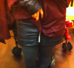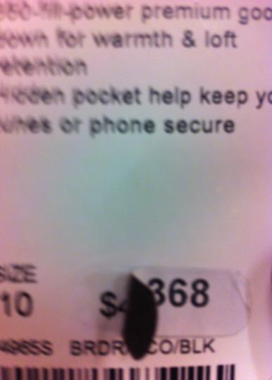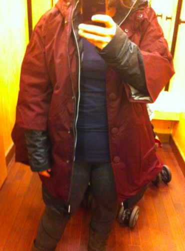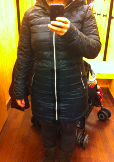 This jacket was originally priced at $4-something but they restickered it to $368. Right off the bat, this is way more jacket than I will ever need in Vancouver. Ever. Unless the Apocalypse is coming. It’s warm indeed so if you live in Saskatoon it will be practical. The cut however is really awful on me. It is bulky and wide and shapeless and the arms are also quite wide. Except the inner down liner which is snug on me. So weird. The outer jacket was quite big on me but the inner jacket was snug around my hips and tight over my Cabin LS. So I’m not really sure how to suggest sizing this. Probalby TTS if you are not as hippy as me…but if you are and you size up the outer jacket will be huge – so the only option is to stay TTS and deal with the snugness of the inner down liner. You can wear this jacket three ways, outer liner by itself, inner liner by itself or with the two zipped together.