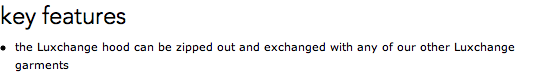 I’m now able to view the upload and even place orders although I’m reading that most people are still not able to do that and the website is completely down. This new jacket, Run: Bundle Up Jacket has a feature called ‘Luxchange‘ which is the hood that can be interchanged with other ‘Luxchange‘ items. Interesting marketing compelling the customer to buy several items out of this line. I like the look of this jacket, especially the hood and collar, but I’m not loving the color blocking and since I’m not in the market for a new jacket it’s an easy pass.