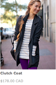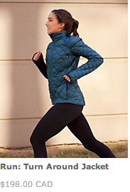 Seriously pissed off tonight. I have a gift card I was planning on using (from a return on an item due to a quality issue), and I went all the way to checkout only to discover my card has no pin # on it. Boo!! I went ahead and ordered the Herringbone Wunder Unders I’ve been wanting but they are mislabelled so who knows what I’ll be getting. The picture looks like Herringbone WUs but the label says Black Rose Herrinbone. Maybe they are reversible? I feel cranky about this. I also liked the look of the wool Clutch Coat…but then I looked over at the Run: Turn Around Jacket for just a few dollars more and $178 for a wrap just didn’t add up. Oh…and then I remembered to read up on the ‘why we made this’ on the Turn Around Jacket and despite product alerts and hang tags today stating it is 800 Power Fill (admittedly too good to believe) and it is in fact 650 Power Fill.
