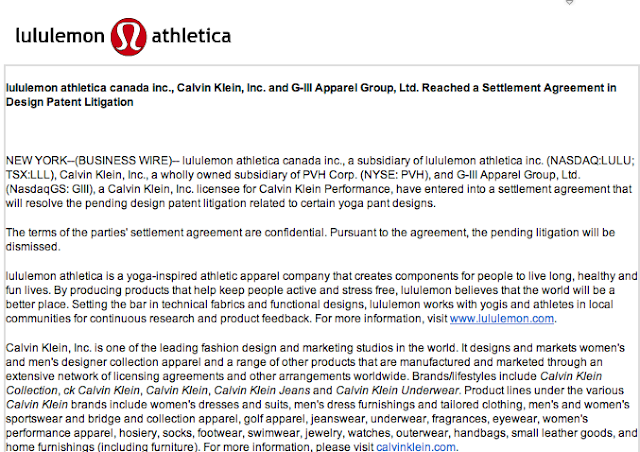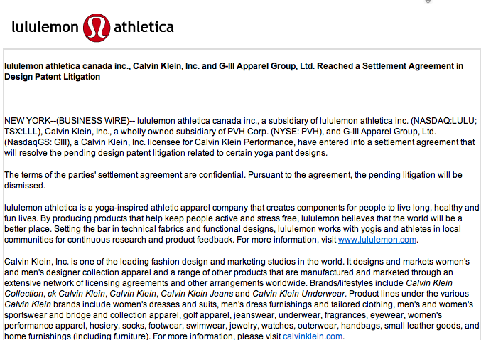 Today Lululemon announced that Calvin Klein and Lululemon have reached a settlement agreement which resolves the pending design patent litigation. In case you hadn’t heard, back in August Lululemon sued Calvin Klein over some of their designs which are similar to Lululemon designs (read here for refresher). The terms of the settlement have not been disclosed but the lawsuit will be dismissed as a result. I would think that if Lululemon means to discourage the many retailers out there that have copied their designs it would have been in their interest to have the settlement a public figure.