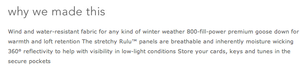Thanks to a lovely reader for sending this product alert image my way. We now have a full view of the What The Fluff Pullover sneak peek that we saw Christine Day debut on CNBC in Clarity Yellow. It’s hard to see the detailing on this one but it looks longer than last years Run: Insulator Pullover (which was short on me) and its 800 Fill (allegedly). Any guesses on price?