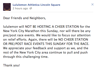 I want to take a minute to acknowledge this gesture that the educators at Lululemon Lincoln Square in New York have made in response to the very controversial decision to continue the New York City Marathon as planned despite the devastation from hurricane Sandy on the citizens of New York. This was the first that ESPN was going to publicize the marathon on TV in several years so there is a lot of sponsorship pressure to continue on the marathon. After the hurricane and devastation, the media attention on this event is also much, much greater. So many petition groups have sprung forward because the majority of people affected that do not have a corporate interest in the money generated by this event are really angry that resources are being used to pull this event off. People in the city are without water, yet this event surely will have pure water for runners to drink. Hospitals are running of generators…yet this event currently has tents already set up that are being powered by generators. Buses will be picking up runners to take them to the starting line (in a hurricane ravaged area), yet ambulances are running low on gas. I know some of you have trained for a very long time for this event and its really unfortunate to have to miss out, its sad, but it certainly is not a devastation to your life.