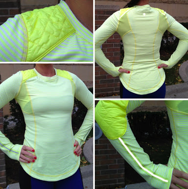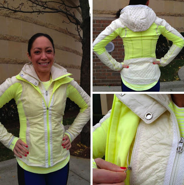 I mentioned a few posts down that I love Clarity Yellow in certain items but in others I hate it. This is the item that I’m really disliking. I saw it in person and it is the busiest pullover/LS item I have ever seen made by lululemon. There is so much going on with this colorway in this top. Satin looking Clarity yellow, quilting pattern, lighter matte clarity yellow in the the body, stripes, circle mesh tone of clarity yellow. It’s just weird in person with the two two distinct patterns, the stripe and the quilted pattern in the shoulders and elbows and clarity yellow looking like it’s different tones in the different fabrics. I’m rambling, but it was just weirdly busy. I think it would have been really nice in solid clarity yellow, or heathered clarity yellow. No contrast quilting. Oh, and I hate the scalloped hemline. I will never buy anything with that kind of a hem.
