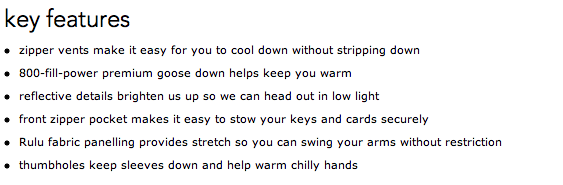 Lululemon can’t seem to give us a straight answer on the key features of their down What The Fluff line and wether the products are 800 Fill like they are claiming or 650 Fill as suspected. Read here to see what the Competition Bureau of Canada says about misleading advertising and labeling  in case you were curious about that.  Several weeks ago when I purchased the Run: Turn Around Jacket which had a hang tag that claimed it was 800 Fill, the website said it was 650 Fill. I phoned the GEC to confirm what the Fill count actually is (last years version offered at the same price is 650 Fill). GEC emailed me the following day as the details where not readily at hand for the people staffing the customer service lines. The ‘Product Gurus’ had looked into my question and verified that the Run Turn Around Jacket is in fact mislabeled and the item is 650 Fill. Lululemon has decided to keep the 800 Fill Count tags on the Turn Around Jackets and they are now claiming it is in fact 800 Fill. So what we know is that we can’t know what the actual fill count is of these items as they are not labeled with garment tags specifying the down details, and Lululemon has zero interest in clarifying the actual fill count of these items for us since it is to their benefit that we believe the fill count is 800 Fill.