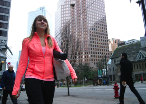 I LOVE these pictures of the Pop Orange Forme Jacket set in overcast Vanouver. Such a pop of color in front of that grey sky.