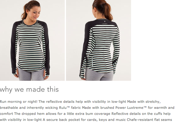 Not a ton that excites me out of these product images, but I do really like the Run: Reflect Pullover and that it is RULU and Brushed Luxtreme with simple styling. Hate the scalloped hem but I can live with that. Looks like todays product drop will focus on the color Flare which isn’t my color. My hopes for upload are Ebb and Flow Crops, or Classic Stripe run Crops, Burning Yellow CRB and that Black/Cream Laceoflage CRB. I wonder if it will be an early upload again like last week which I think was just before 10pm PST.