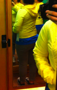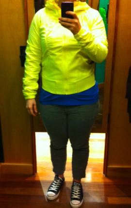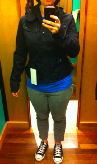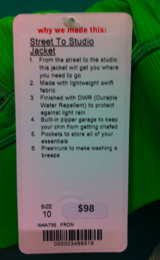 I tried on the Street to Studio Jackets this afternoon and liked them, except for the length. The size 10 (my TTS) was pretty roomy in the body and arms but pretty cropped on my long torso. I liked the fit of the 8 better on me in the chest and arms but it was even shorter in length. Had the length gone over my hips in the 8 I would have loved it. I think this jacket is meant to replace the Dance Studio Jacket but I find that a little odd since the Dance Studio Jacket is reversible and quite structured and figure flattering. This one is cute of course, but doesn’t have the ‘sexyness’ if you will that the Dance Studio Jacket has. I thought the price at $98 was fair. It’s Durable Water Resistant, and the inside is cool max and quite soft. I brought home the size 8 in Mellow Lemon (really loved both color options) and will try it on with a few other pants. These where not ideal pants to try these jackets on with so I’m willing to try it on with a few more items before I decide. Right now though, the jury is out.