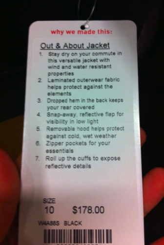 This jacket was priced quite high in my opinion. It’s similar weight to my Right As Rain Jacket, way shorter but with a few more features. I liked this jacket from the high waist up, and really hated it from the high waist down. Its super short and the back tail has a really exaggerated flare. I loved the military style pockets, but this jacket is really short. I grabbed my TTS 10 and it was roomy in the bust but because of the stiffness of the fabric I would not size down, and also because I cannot afford to lose any length on this one. Easy pass for me.