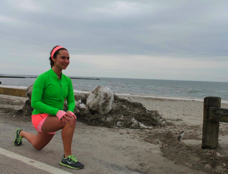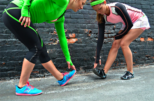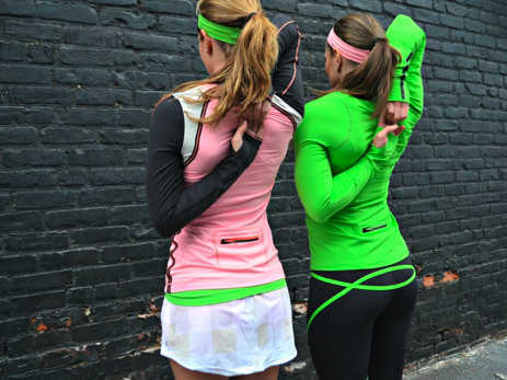 The Run: Rise And Shine in Frond with Run: Layer Me LS in Bleached Coral/Black/Dune, Run: Pace Crop and Run: Pace Skirt.