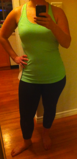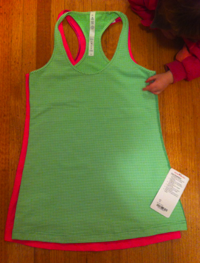 All this week I’ve been writing about how disappointed I am in the texture of this Gingham Frond Green Cool Racerback. I still am as it’s so warm that I’ll probably only wear it casually and not to Crossfit. I will try it out though and report back how wearable it is for sweaty workouts but I’m pretty sure I will suffer with heat exhaustion over wearing this one. Anything for my lovely readers though 🙂 I also agree that the close up of the gingham print looks sort of like a dish towel…but, when I opened my package up I realized how pretty the color is. Some prints depending on the scale end up reading as a different color rather than a print, and this is one of those. To me I see a light version of frond and not so much a gingham print. Its a pretty green apple green! The sizing is definitely weird on this one. I ordered a 10 and it is SNUG! Not just snug but the material is much more compressive than my 8’s. I’m not going to size up in this one but I think a lot of you will decide to do that when you try this one on. After 2 months and 19lbs down on the Whole30 diet, I’m on the cusp of a size 8, but my 10’s still look like my appropriate size. I was really surprised how snug this size 10 was. You can see in the picture I’ve added below how much smaller and shorter it is compared to my other size 10 Cool Racerback. It’s not just the size difference though, it’s the fabric and compression that makes it feel smaller. Maybe it has less lycra and more mechanical stretch. I dunno.
