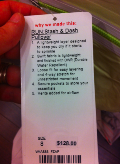 Run: Dash & Stash Pullover was in as well and when I saw it on facebook this morning and read that it was coming in Faded Zap I was sure I’d be picking one up. I liked it enough (this is size 8 on me. I think I’m size 8 on top now), but didn’t LOVE it. The material felt really thin and delicate and since I do have a pullover (Run: Track & Field Pullover) which is slightly thicker, I didn’t feel like I needed to get this one. It’s shear, and it’s quite stretchy but its not much of a wind blocker and I didn’t think it looked as good on me as my Track & Field. Sad that so far the Faded Zap CRB and this have both been busts for me.