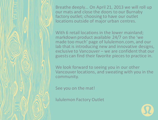 I was just informed that the Vancouver Lululemon Factory Outlet effective April 21st. I can’t say I’m terribly surprised or upset as I’ve always found the outlet to be mismanaged in terms of driving sales. In the past two years I’ve made more stops at the Burlington outlet in the US than I have to the Vancouver area outlet which is a heck of a lot closer to me (around a 2 hour drive closer!). Yet I still have never purchased anything at the Burlington outlet either. Reasons that have deterred me from shopping at the Vancouver outlet has been that I find better sales at regular stores, I mostly see large runs of damaged items or bad runs of garments marked down by a tiny amount. Seems like the last stop before the lulu graveyard most of the time. Items that are sewn incorrectly, are too sheer to go to market, have dye issues, etc. The store is tiny, has no bathrooms nearby, it’s in an industrial area going thru a lot of construction so very congested traffic and frankly, the prices have to be killer for me to forego the two week return policy.