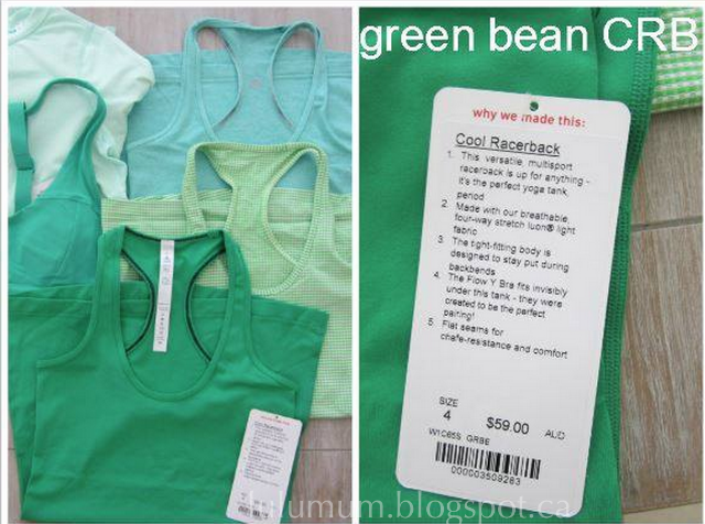 Thanks to a very lovely reader from Australia, ‘Ms. S’ We have a great shot of the new Green Bean Cool Racerback next to other recent greens. From left to right clockwise: Fresh Teal, Heathered Menthol, Frond Gingham, Green Bean and Very Green. Ms. S describes this green as a very vibrant, more so than what is captured in the picture. I’ve also been told its a very vibrant apple green and that it’s quite soft (No Polyester!!!!) I can’t wait for this CRB to come to North America. Incidentally, I am also super excited for a Pretty Pink Slalom Stripe CRB and Vinyasa Scarf and a Heathered Soot Light Cool Racerback. Somebody buy my ‘for sale’ items listed on the right menu…my wish list is now longer than my budget.