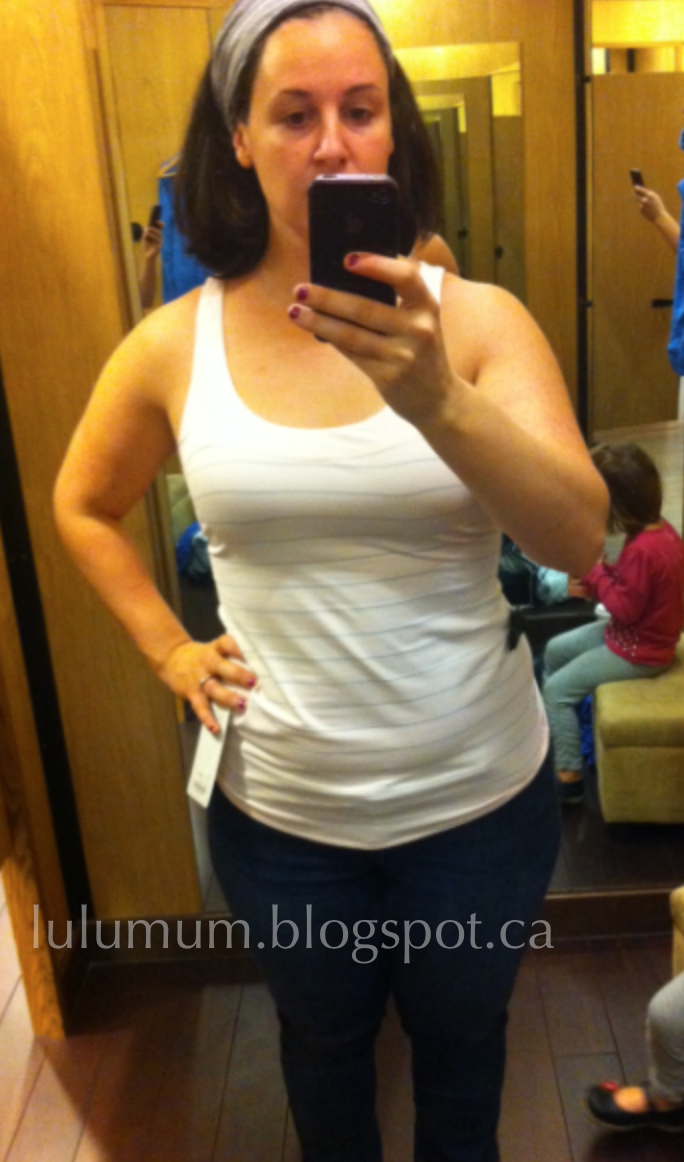 This is the Pretty Pink Slalom First Base Tank in my TTS. Not the loveliest with jeans but I really quite like it to be worn with none muffin top causing pants like my In The Flow Crops. The material, RULU light is very soft so it will be perfect for wearing under itchy sweaters. Its slightly shorter than CRB’s but not so much that it looks odd on my long torso. The scalloped hem isn’t a really offensively exaggerated so I’m not bothered by it. I’ve been really in the mood for a RULU light tank so I think I will keep this one as an alternative to CRB’s for crossfit, something with a little more coverage in the straps and neckline. I really like it in this color as well, it lends itself to the sweetheart neckline detailing.