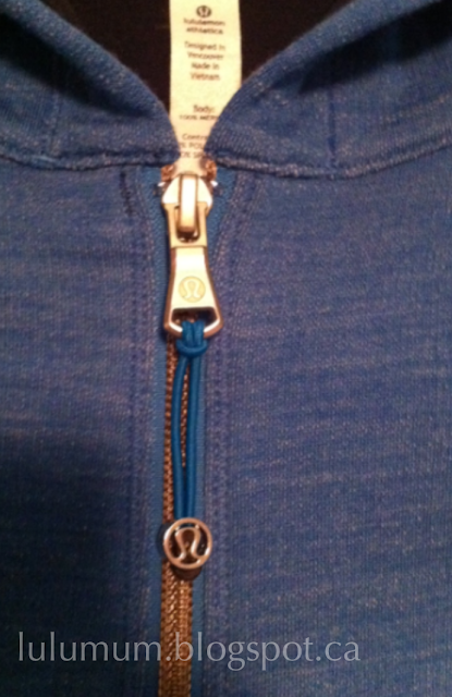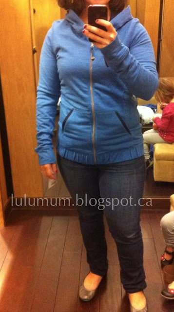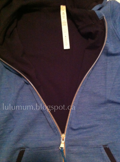 Anyways, I saw the new Cornflower Blue Harmonious Hoodie in today and had to give it a try. I was smitten with it the moment I took it off the hangar to try it on. Its got this beautiful weight and drape to it thanks to a soft inner liner made of cotton jersey (95% cotton, 5% lycra). It really reminds me of my old beloved Aura Hoodie from Spring 2011 (sadly I since sold it) which was a soft cotton jersey that felt like pajamas. I kept hoping for another hoodie to come out in that same material but they just never used it again until now. The other thing that surprised me is that this jacket is actually quite long (close to being SFT length) and slouchy fitting. Most of the pictures I’ve seen of it since Monday have been quite fitted and short so I wonder if stores are featuring this jacket sized down. I like it TTS and slouchy.  The outside of the jacket is 100% Merino Wool, NOT a wool blend. Because it’s wool it has a nice texture that makes it look almost like a very fine cardigan knit. It just feels really luxurious on, warm and cozy while still feeling really light weight. I didn’t love the price of $150 with taxes but thinking about the extra special detail of the material, the cut, and how it looks on, I’m definitely wanting to keep it. October has been pretty light on my Lululemon budget anyways.