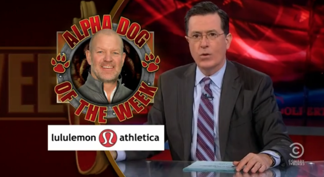 Last week, The Colbert Report featured our other Canadian treasure, Toronto Mayor Rob Ford (why don’t we have long range tranquilizer darts for situations like these?). This week, Stephen Colbert talked about Chip Wilson in Alpha Dog Of The Week. ‘Apparently Spanx is not an invitation’. LOL!