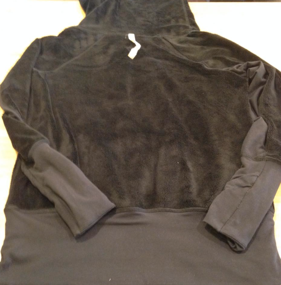 Inside of the Post Chaturanga Pullover. Its lighter than the Don’t Hurry Be Happy Pullover since there are several panels of ribbed luon where there is no sherpa. This lightens it up significantly. Also, its a looser fit so you don’t have bunchy sherpa right next to your body.